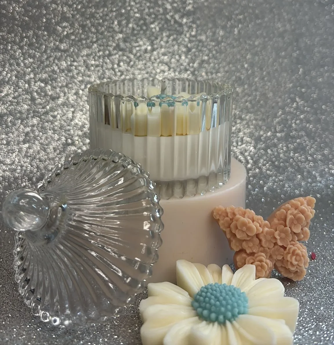 Vela decorativa de soja 100% natural hecha a mano, en bombonera de cristal. Ideal como regalo o adorno. Sin ingredientes tóxicos y 100% ecológica.