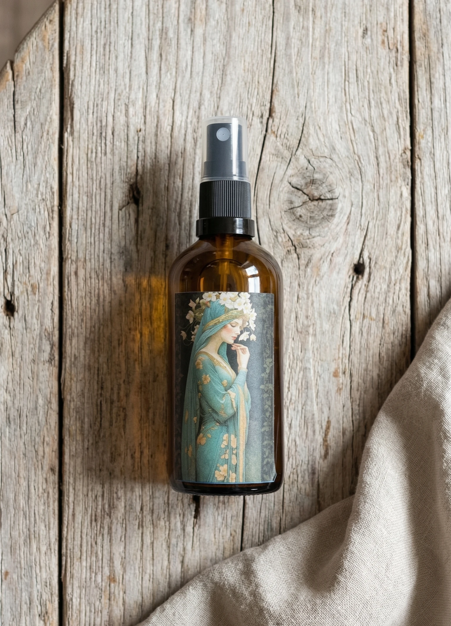 Bruma de almohada artesanal con aroma natural a flor de naranjo, ideal para perfumar el hogar y crear una atmósfera de calma, frescura y bienestar.