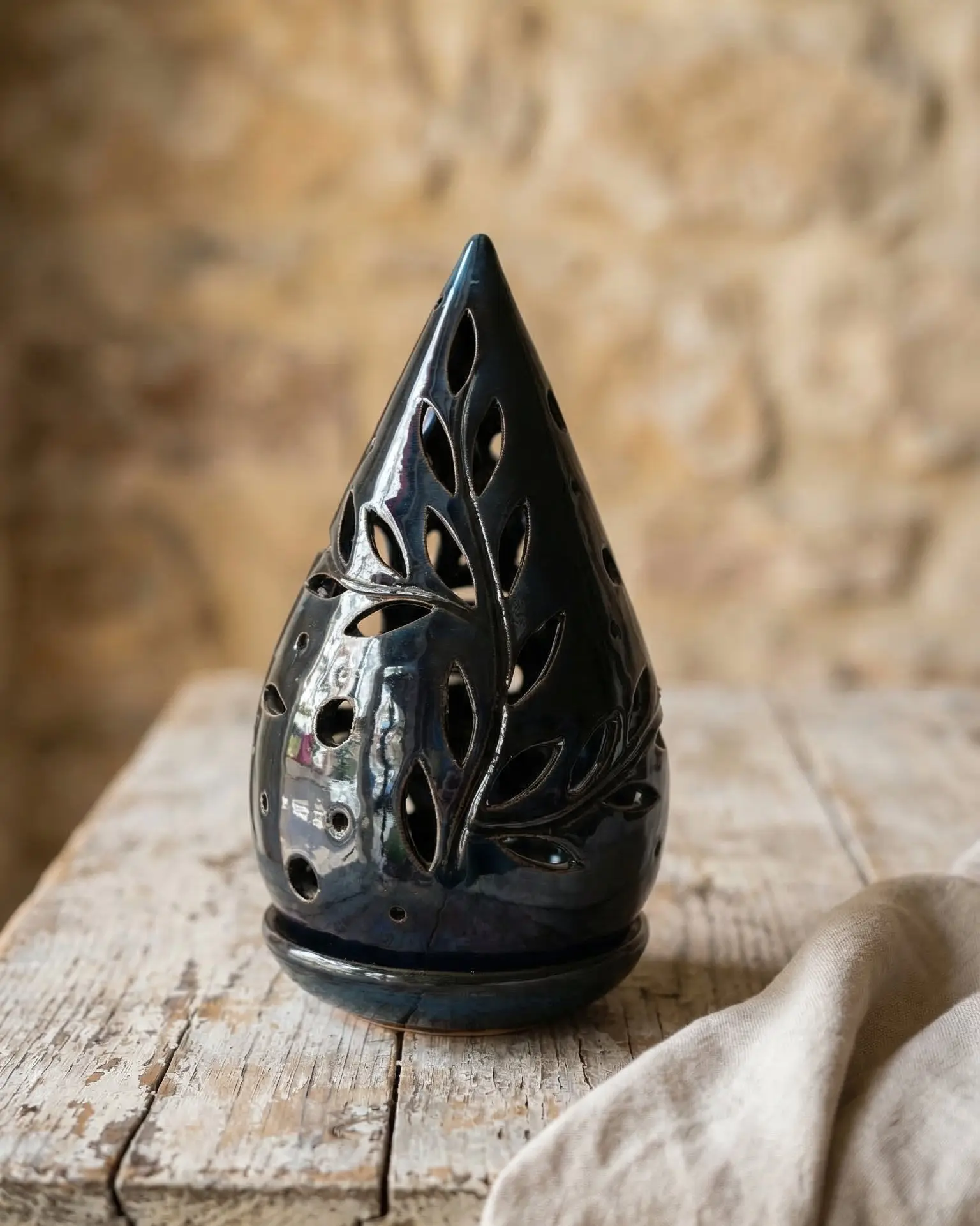 Gracias a sus delicadas perforaciones orgánicas, este candil proyecta una luz tenue y envolvente que transforma el ambiente al instante. Ideal para usar con velas o wax melts, crea un juego de luces y sombras que invita a la calma y al descanso.