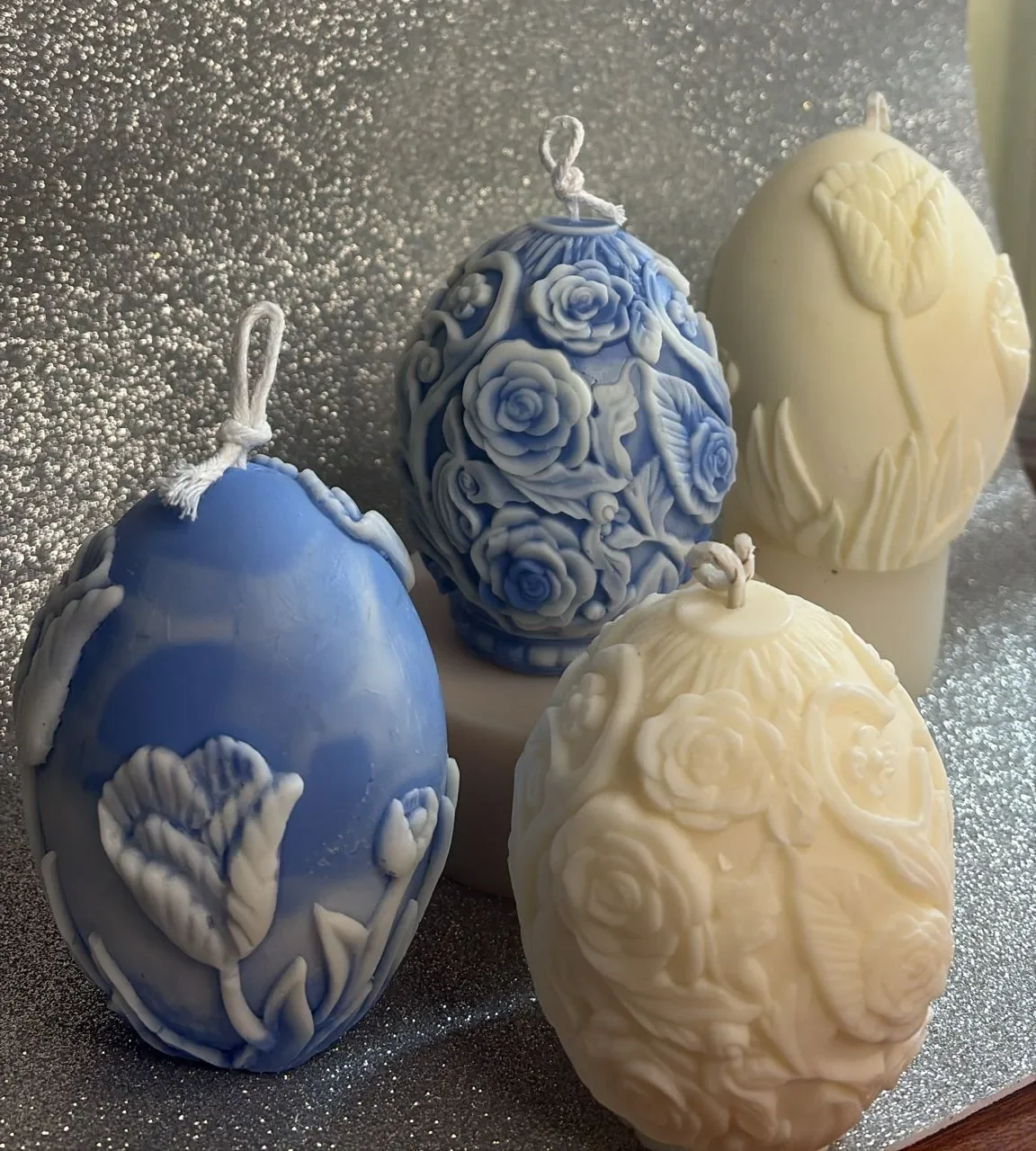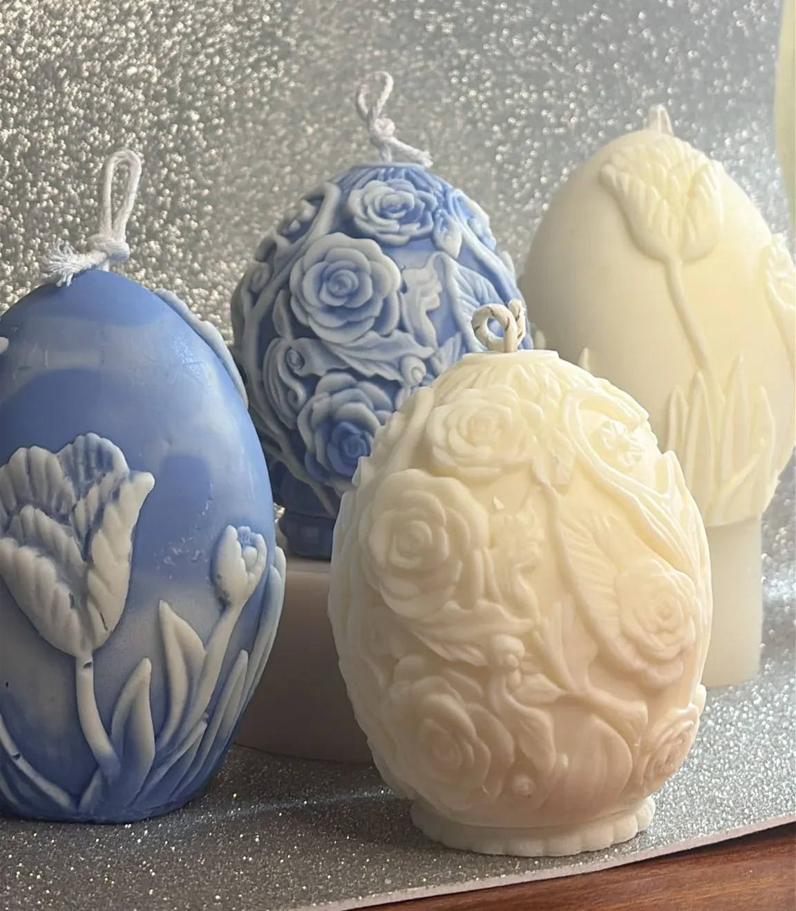 Vela decorativa de soja 100% natural, elaborada artesanalmente, con forma de huevo de Pascua con motivos florales. Sin ingredientes tóxicos y 100% ecológica.