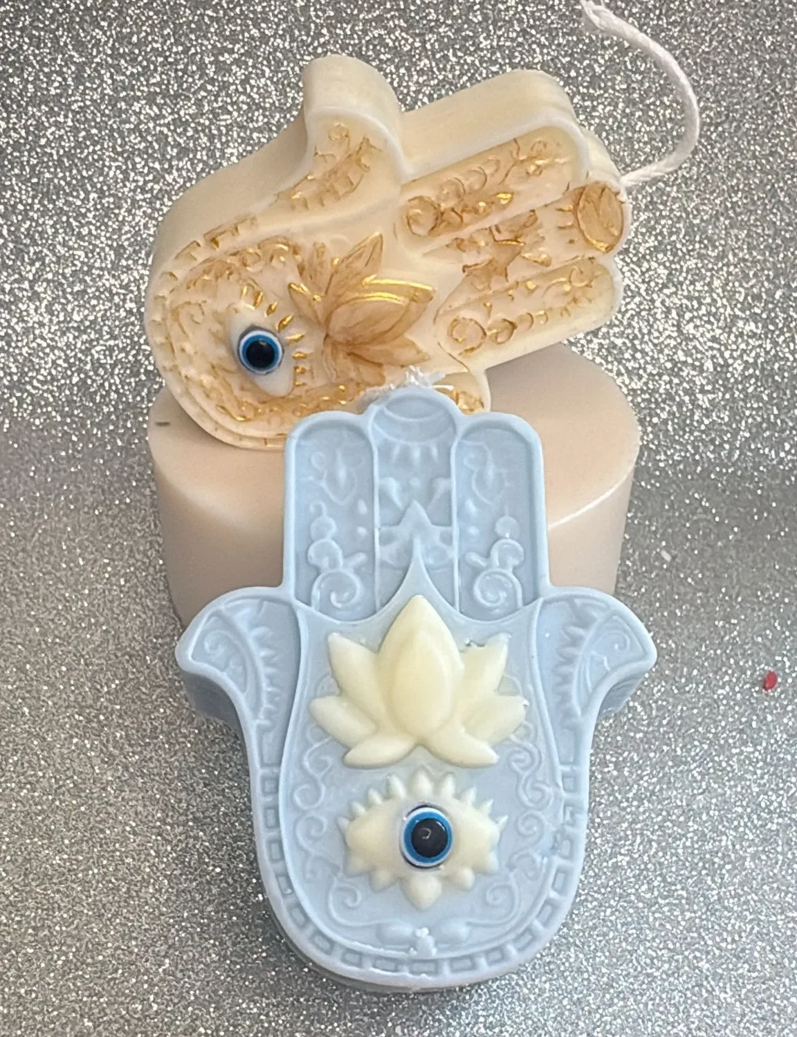 Vela de soja 100% natural, hecha a mano, con forma de mano de Fátima. Disponible en azul celeste y beige. Ideal como regalo original o como complemento de decoración para tu hogar. Libre de tóxicos y completamente ecológica.