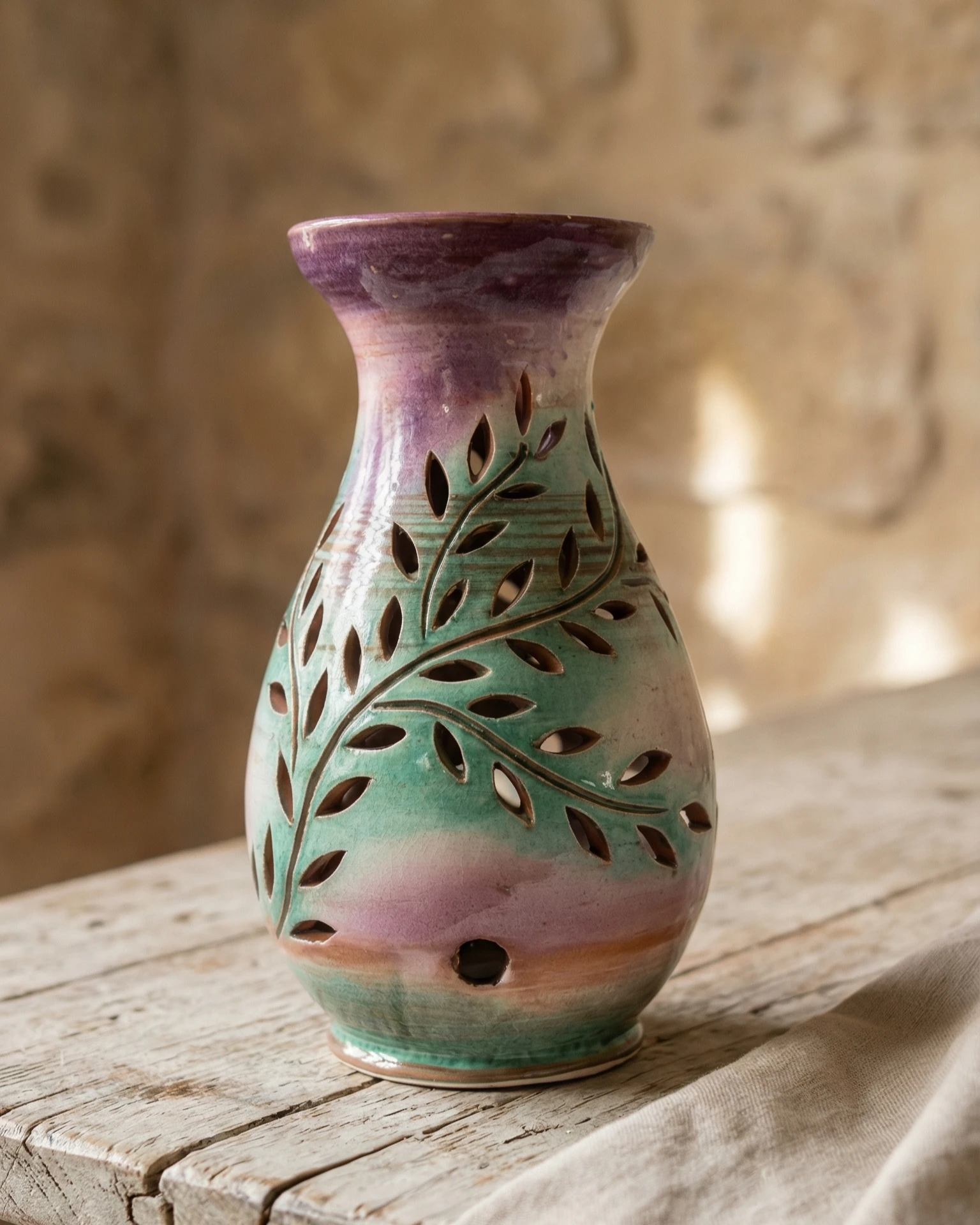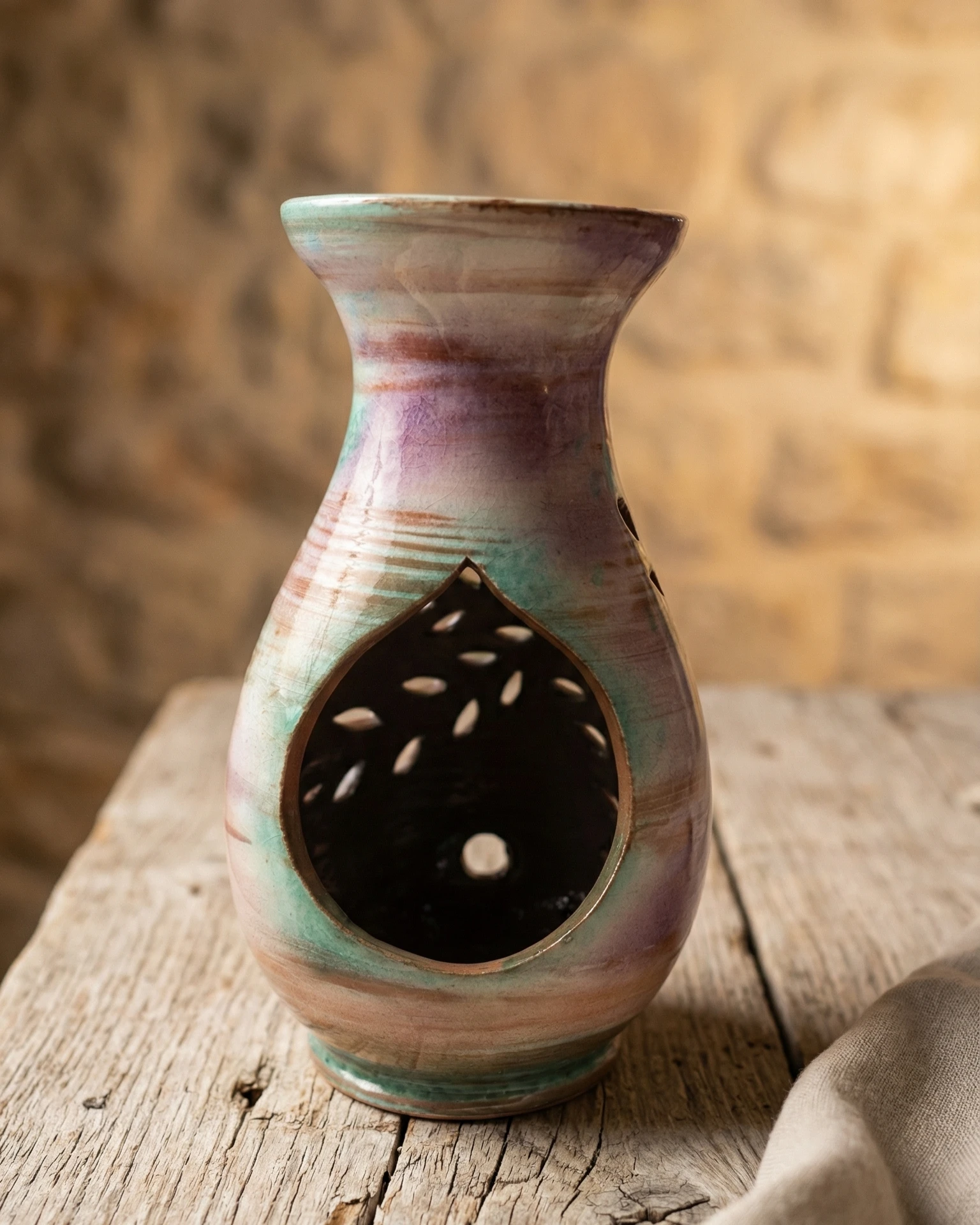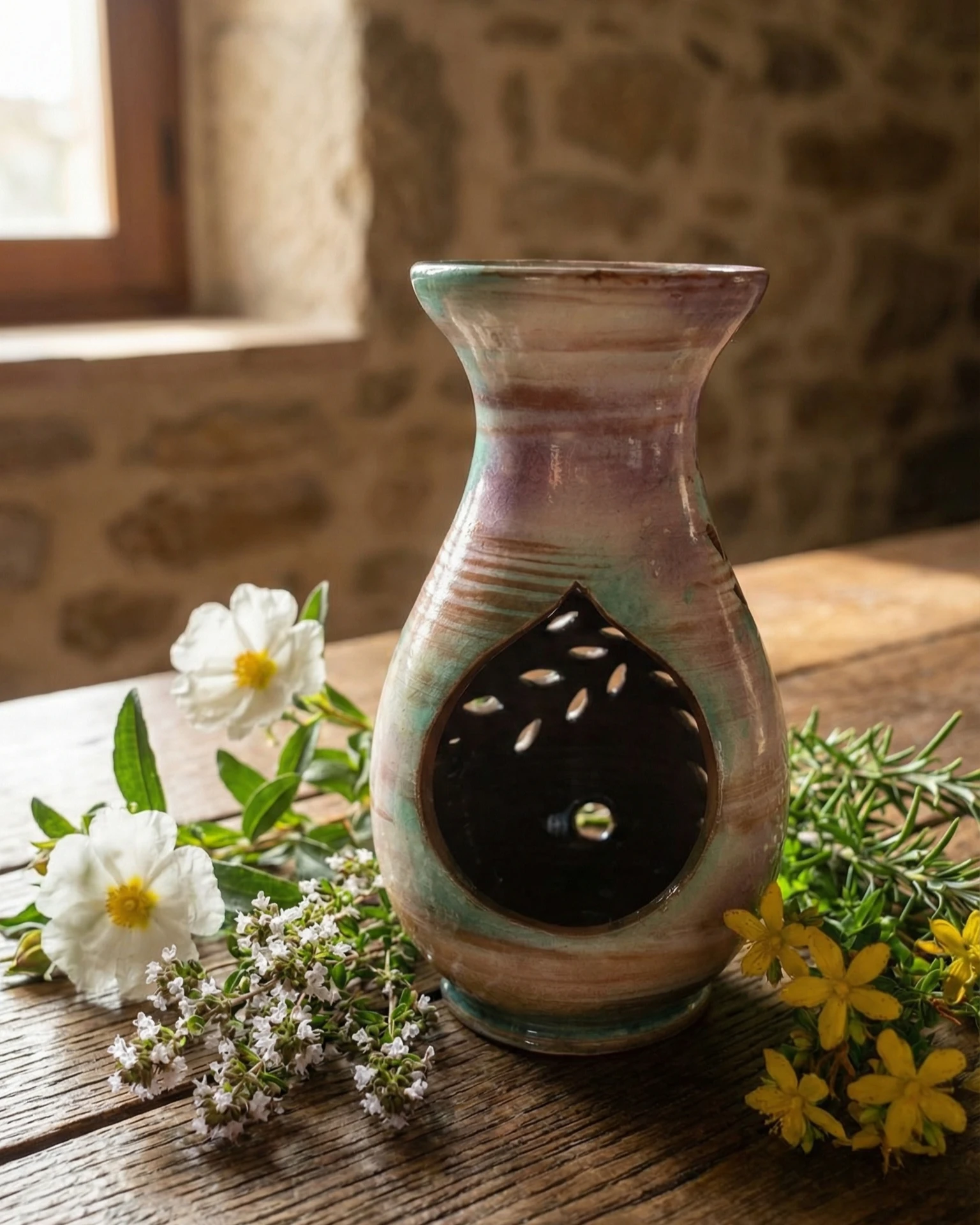 Elaborado en cerámica cordobesa artesanal, cada quemador es único. Sus tonos suaves, que combinan matices verdes, tierra y rosados, evocan la naturaleza y aportan una sensación visual de equilibrio y serenidad. El delicado diseño calado en forma de hojas permite que la luz de la vela interior se filtre creando un ambiente cálido y envolvente, ideal para momentos de descanso, lectura o autocuidado.