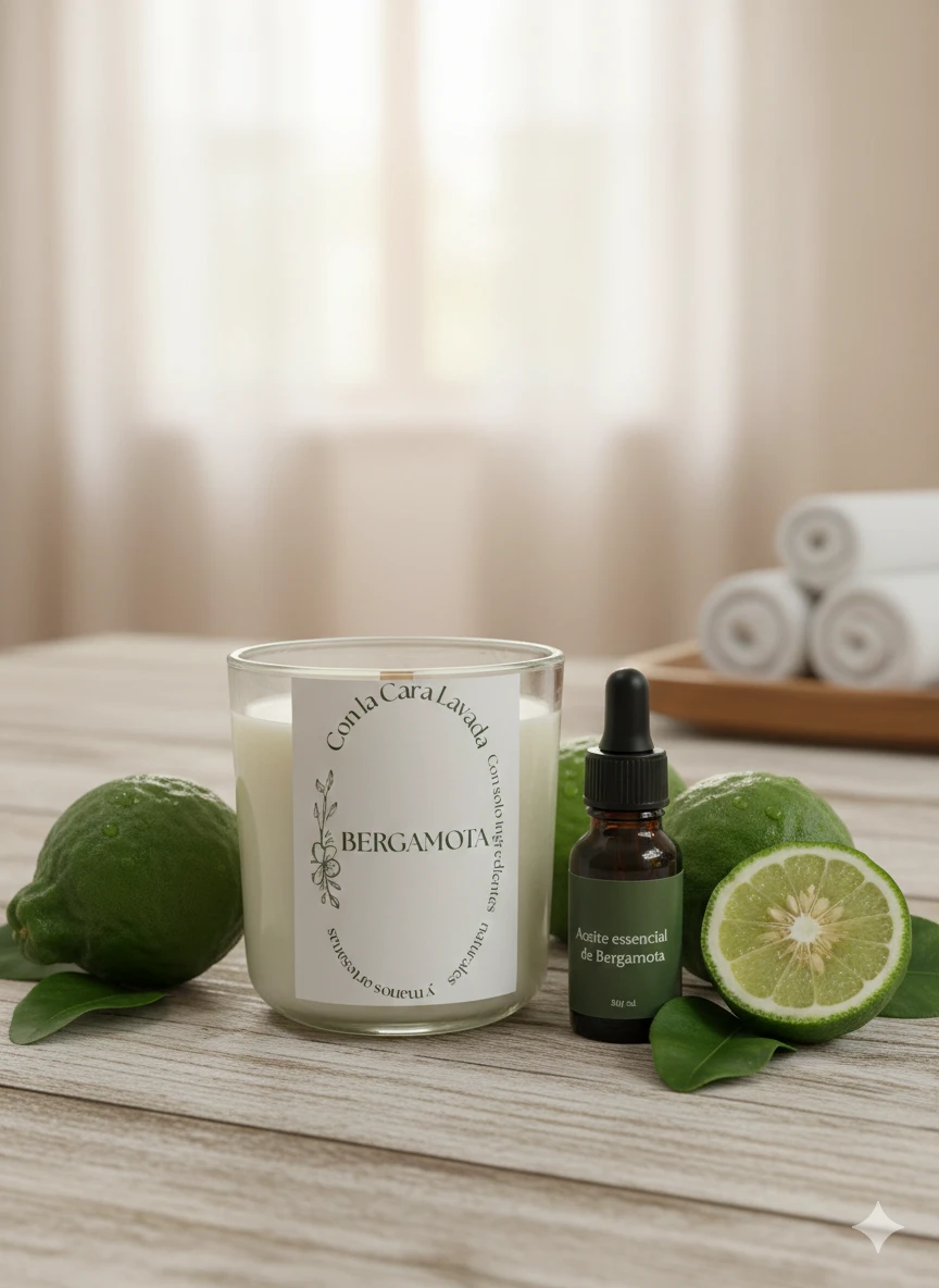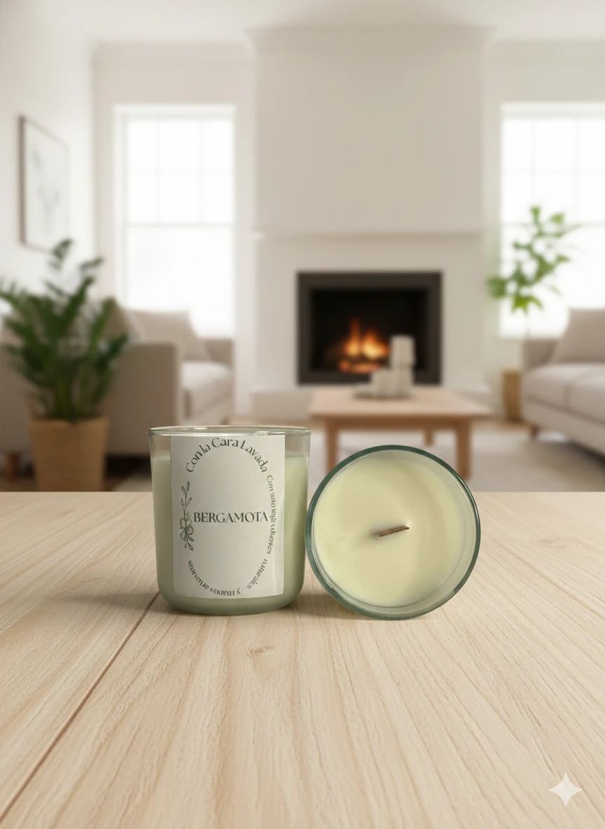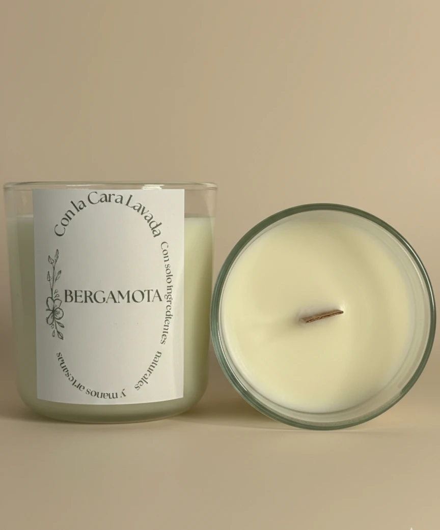 Vela artesanal de soja con aroma natural a bergamota, pensada para aportar frescura, equilibrio y energía suave a tus espacios.