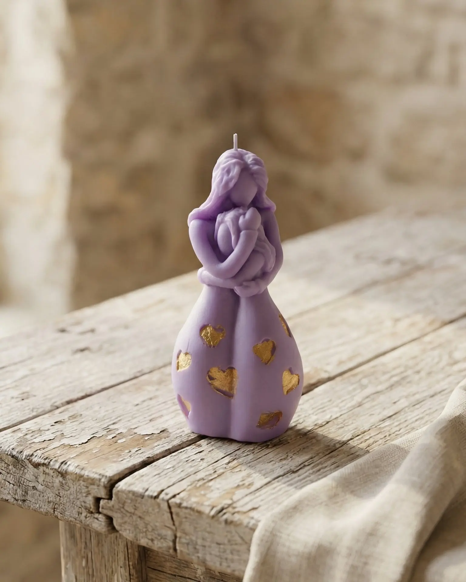 Moldeada a mano en cera de soja natural, esta vela representa la delicadeza de un instante íntimo: una madre abrazando a su hijo. Cada curva, cada detalle, transmite ternura, conexión y calidez.