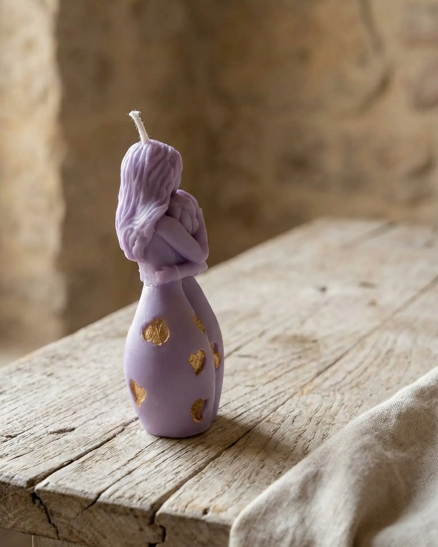 Su suave tono lila, combinado con pequeños toques dorados, aporta una estética serena y elegante que encaja perfectamente en espacios acogedores, naturales y llenos de alma.