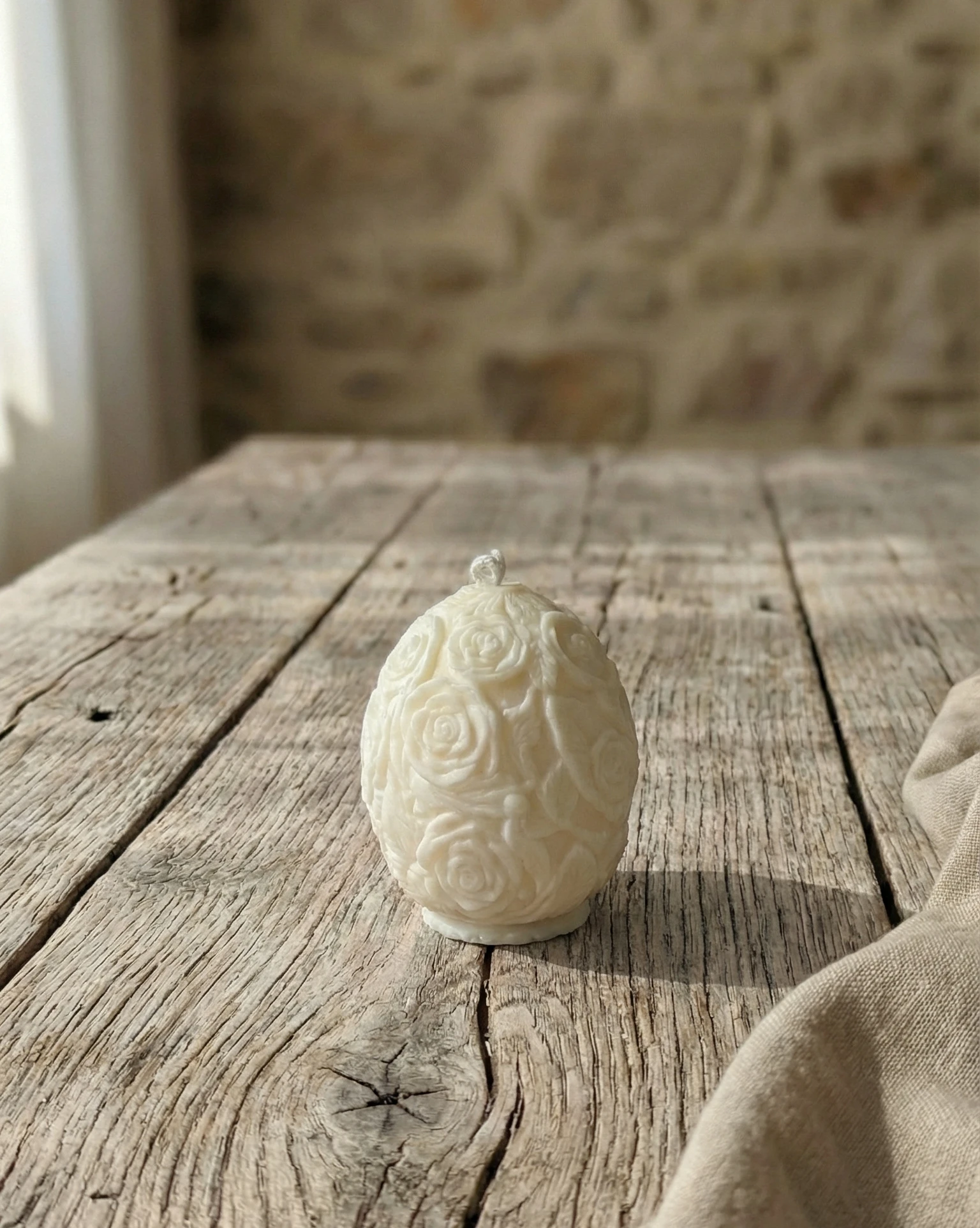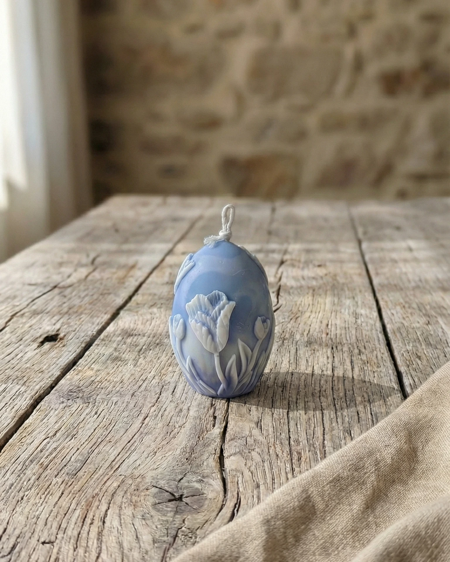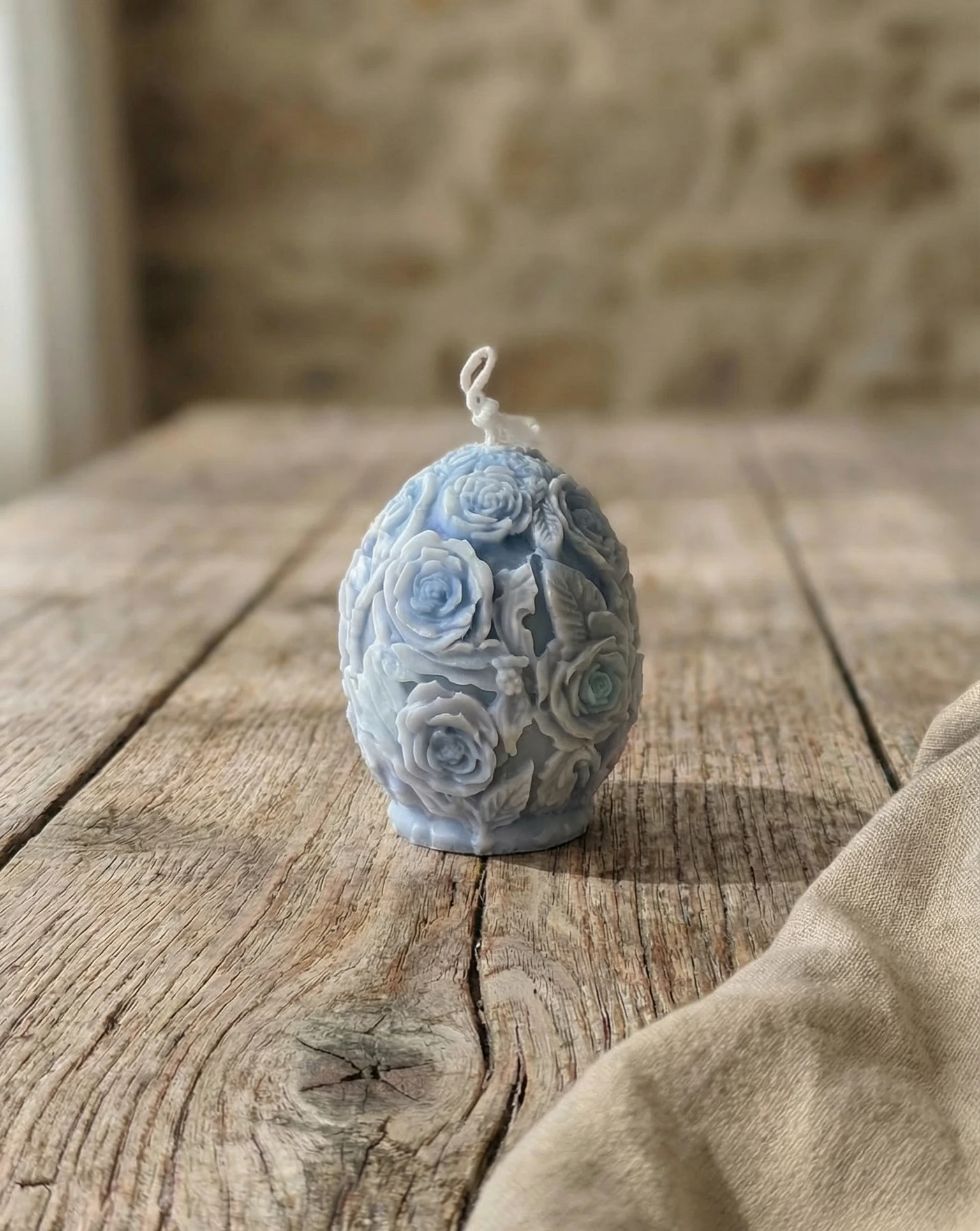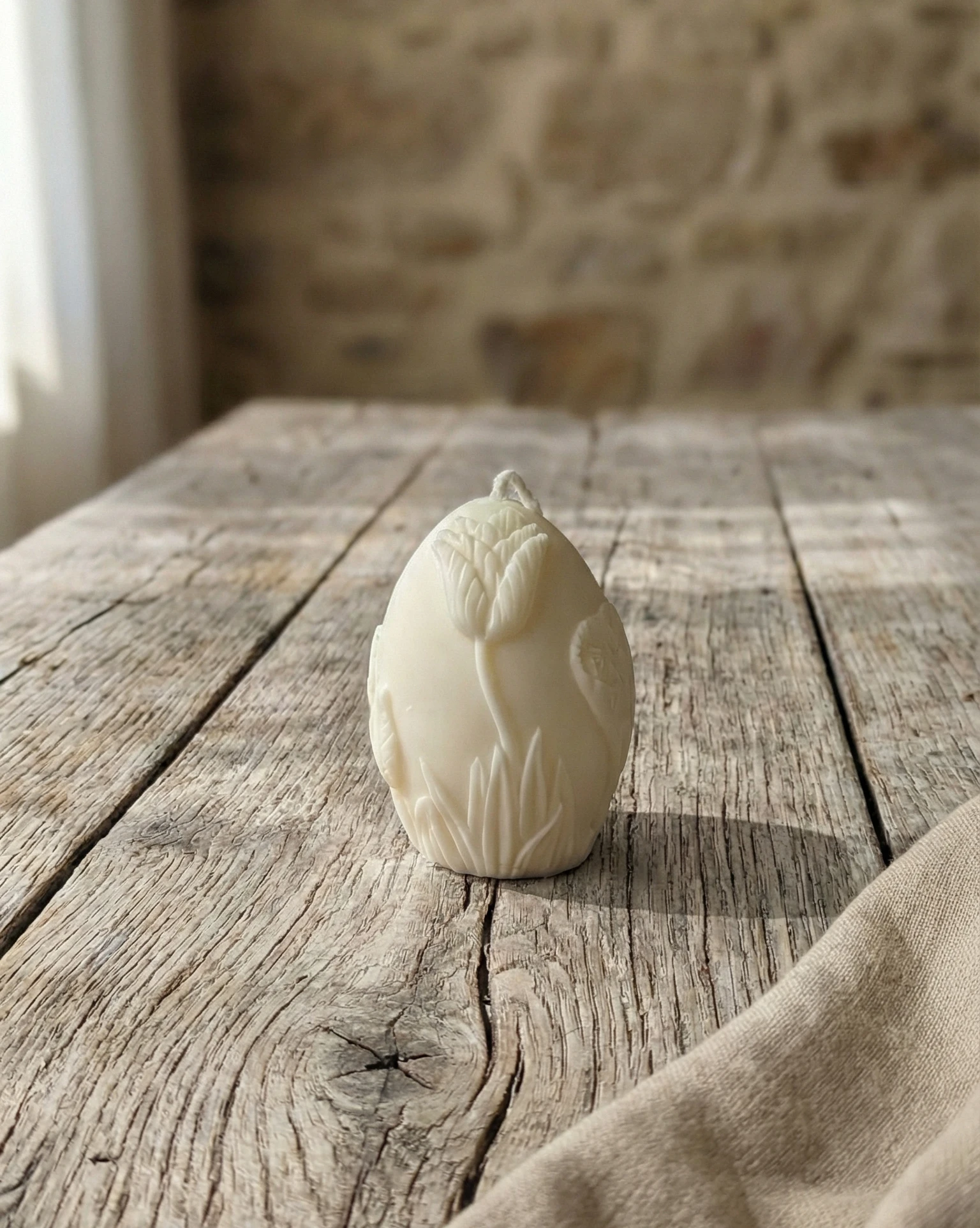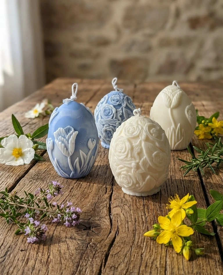 Vela de soja decorativa artesanal con forma de huevo decorado y delicados relieves florales. Una pieza decorativa elegante inspirada en la primavera y en la naturaleza.