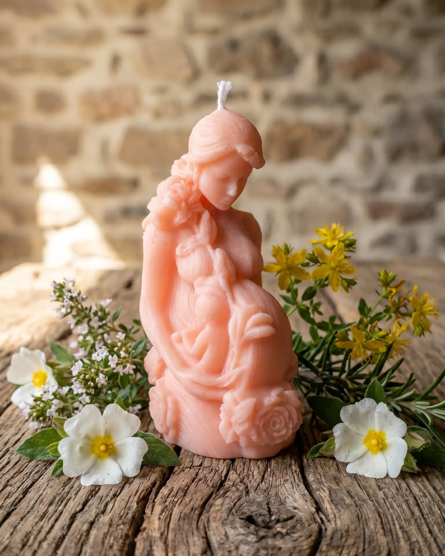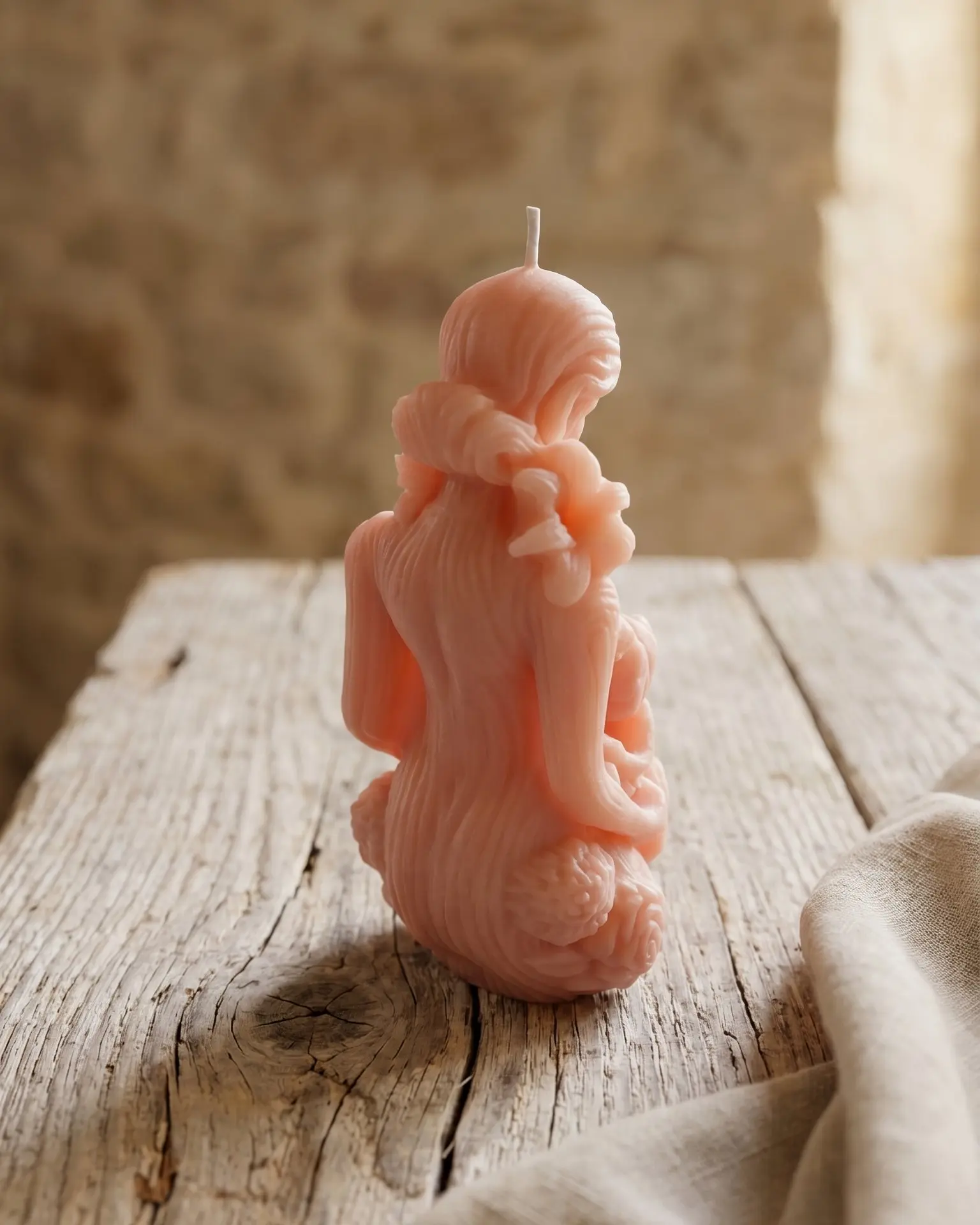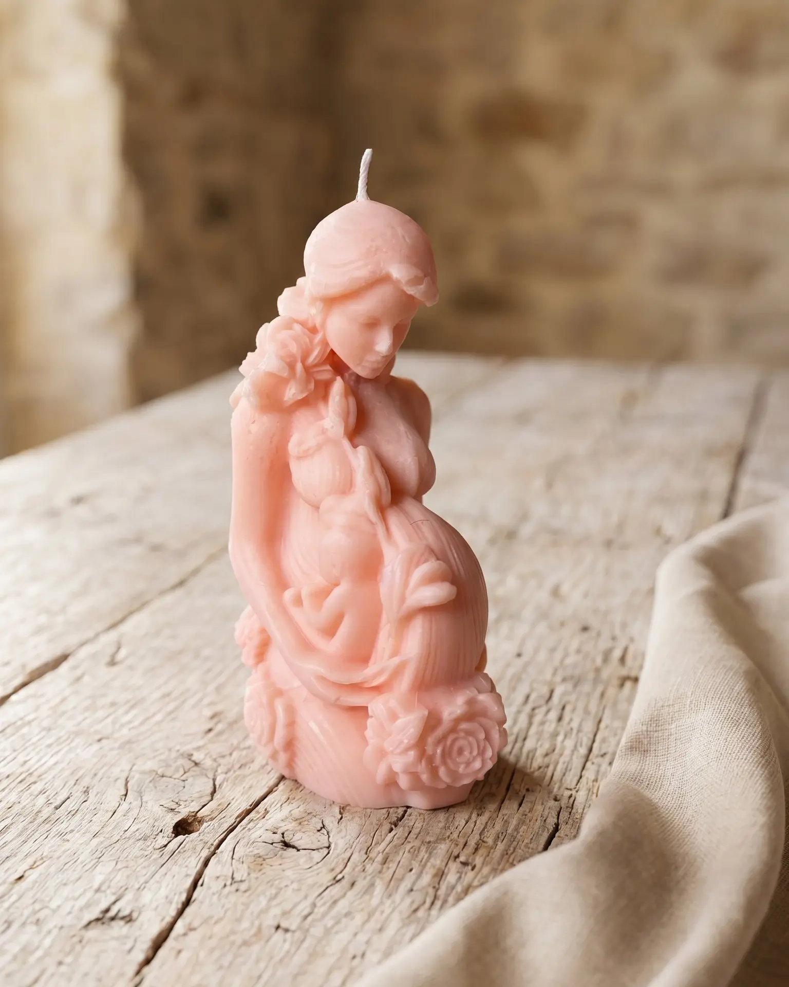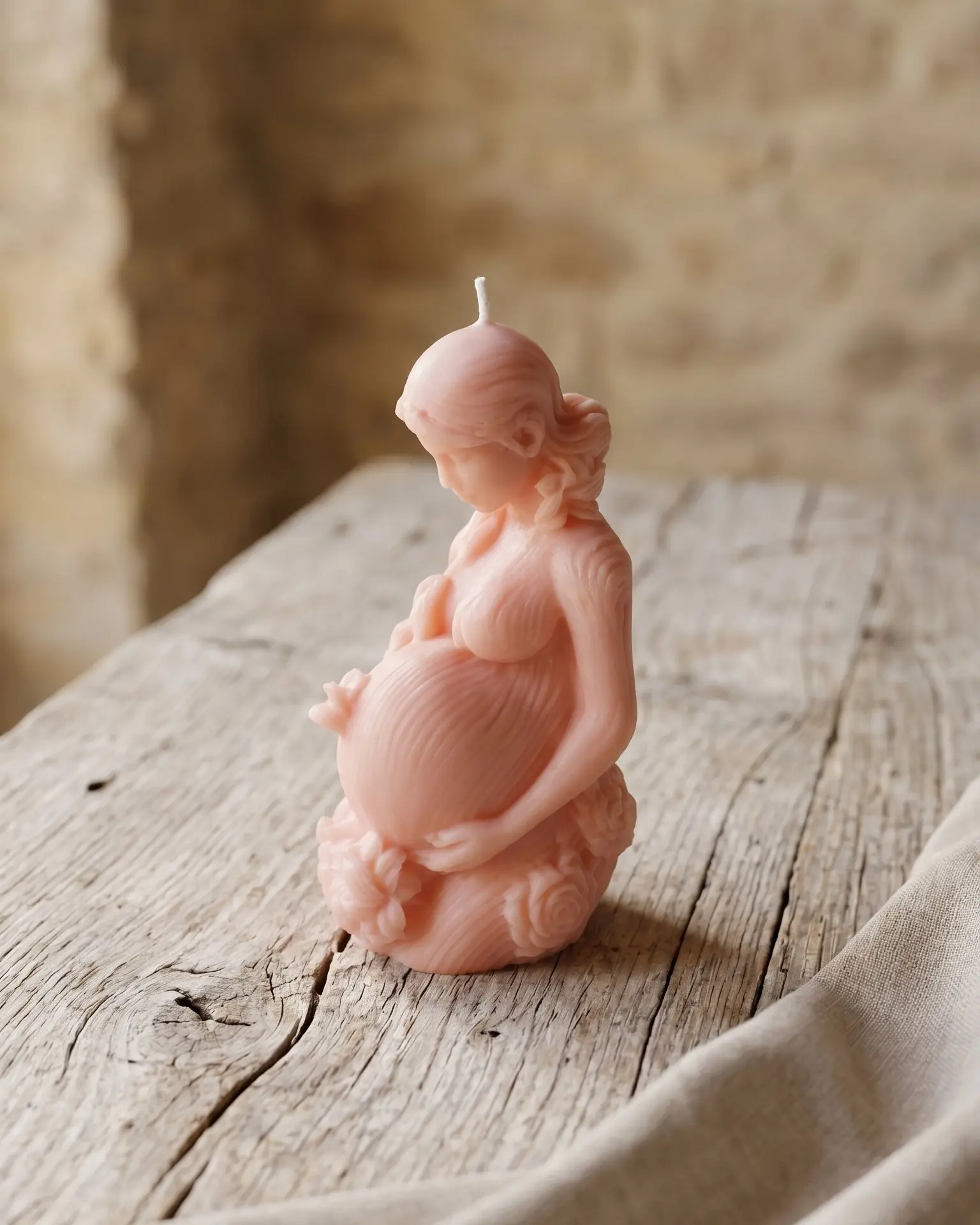 Moldeada a mano en cera de soja natural, esta pieza representa la figura de una mujer embarazada en un gesto íntimo y sereno. La suavidad de sus formas, la delicadeza de los detalles y su tono cálido crean una sensación inmediata de paz, conexión y ternura.