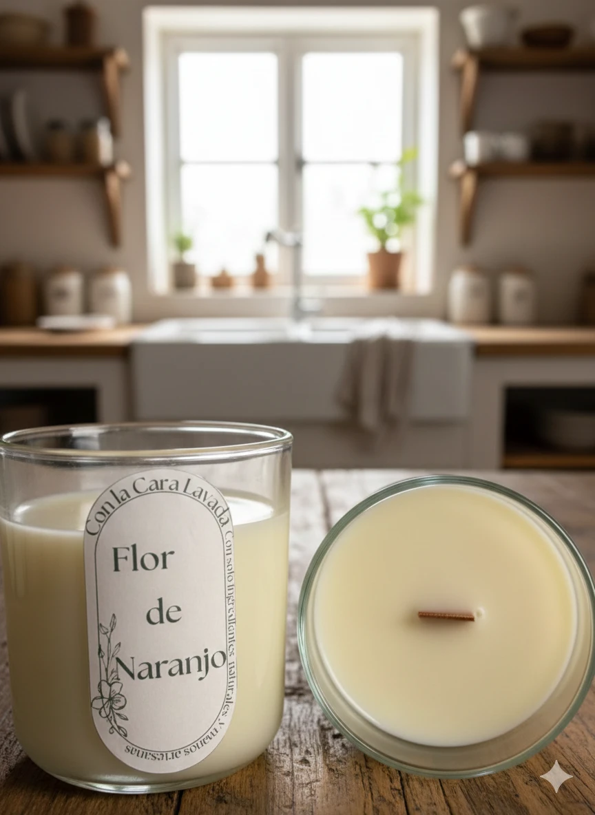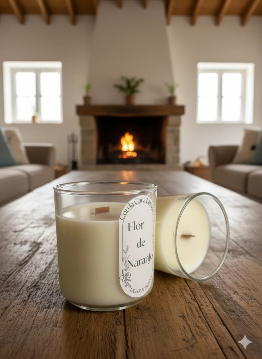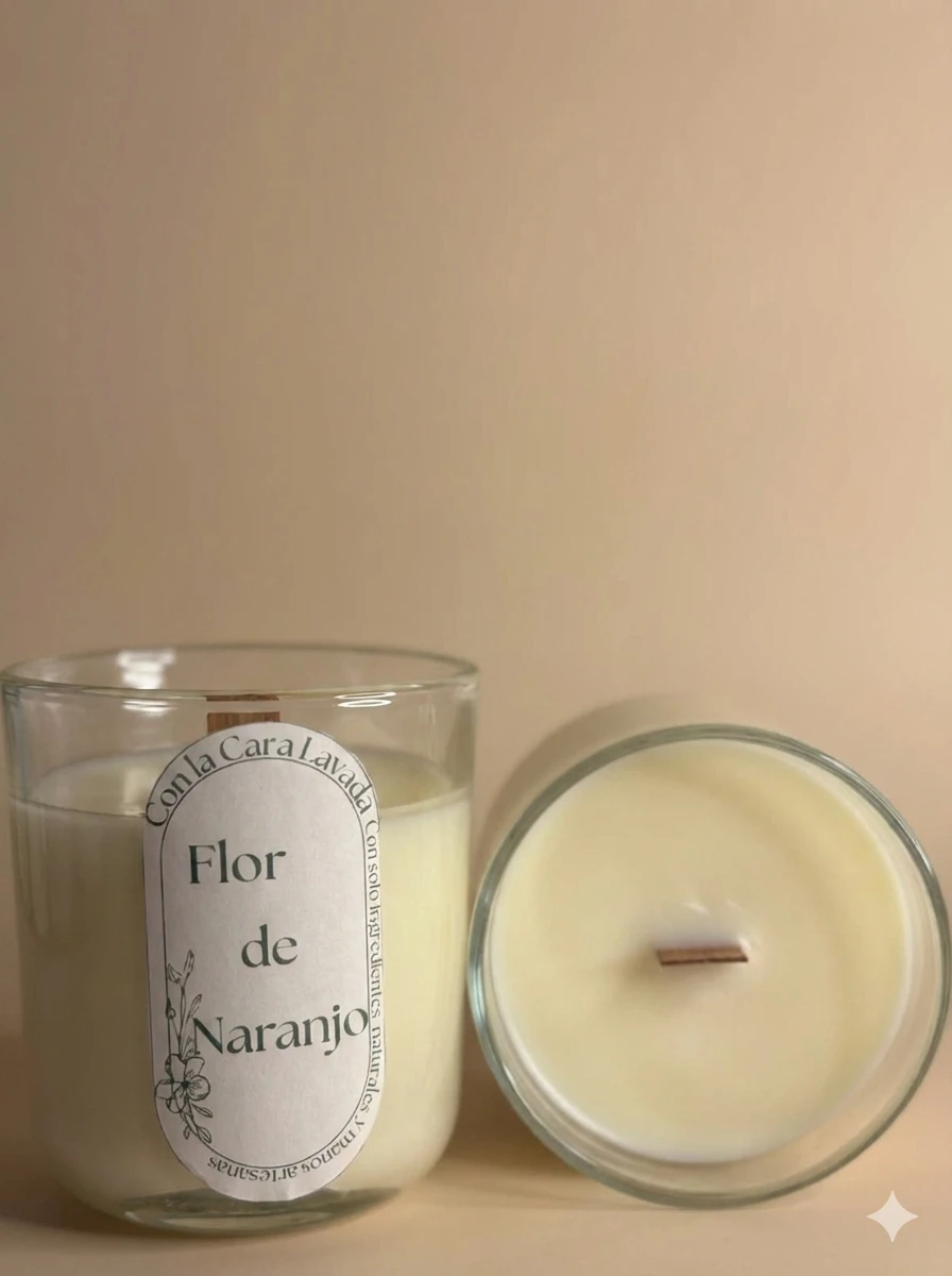 Vela artesanal de soja con aroma natural a flor de naranjo, pensada para crear un ambiente luminoso, sereno y acogedor en el hogar.
