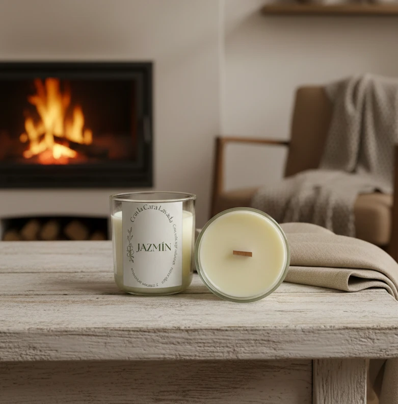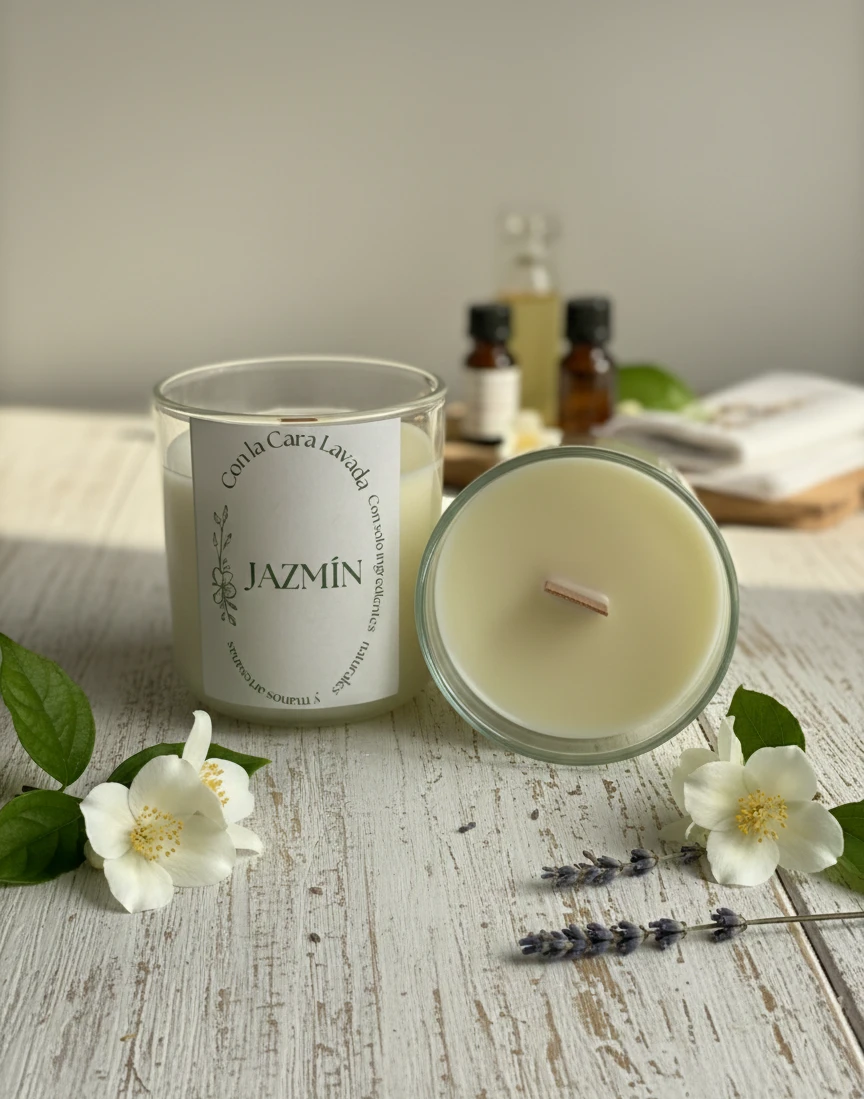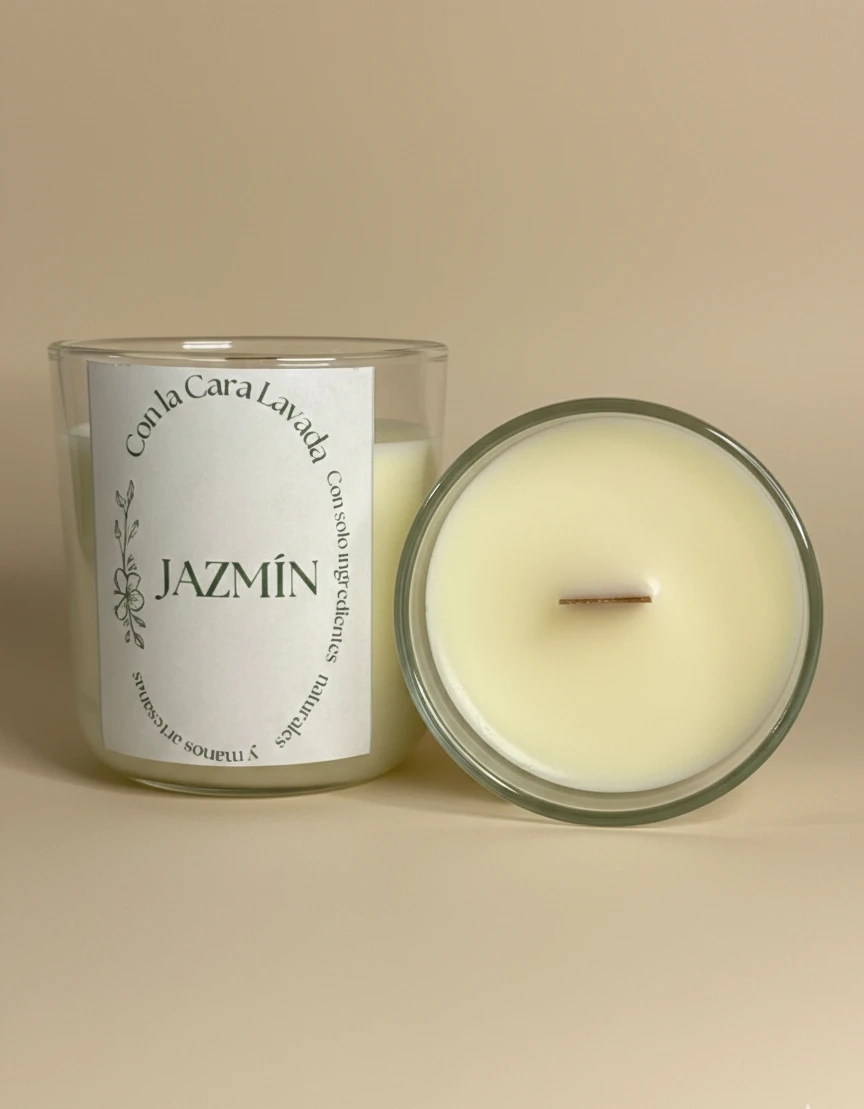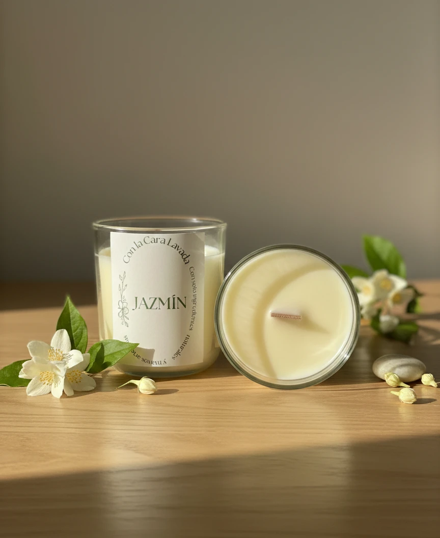 Vela artesanal de soja con aroma a jazmín, floral, delicado y envolvente. Ideal para crear un ambiente íntimo, sereno y acogedor.