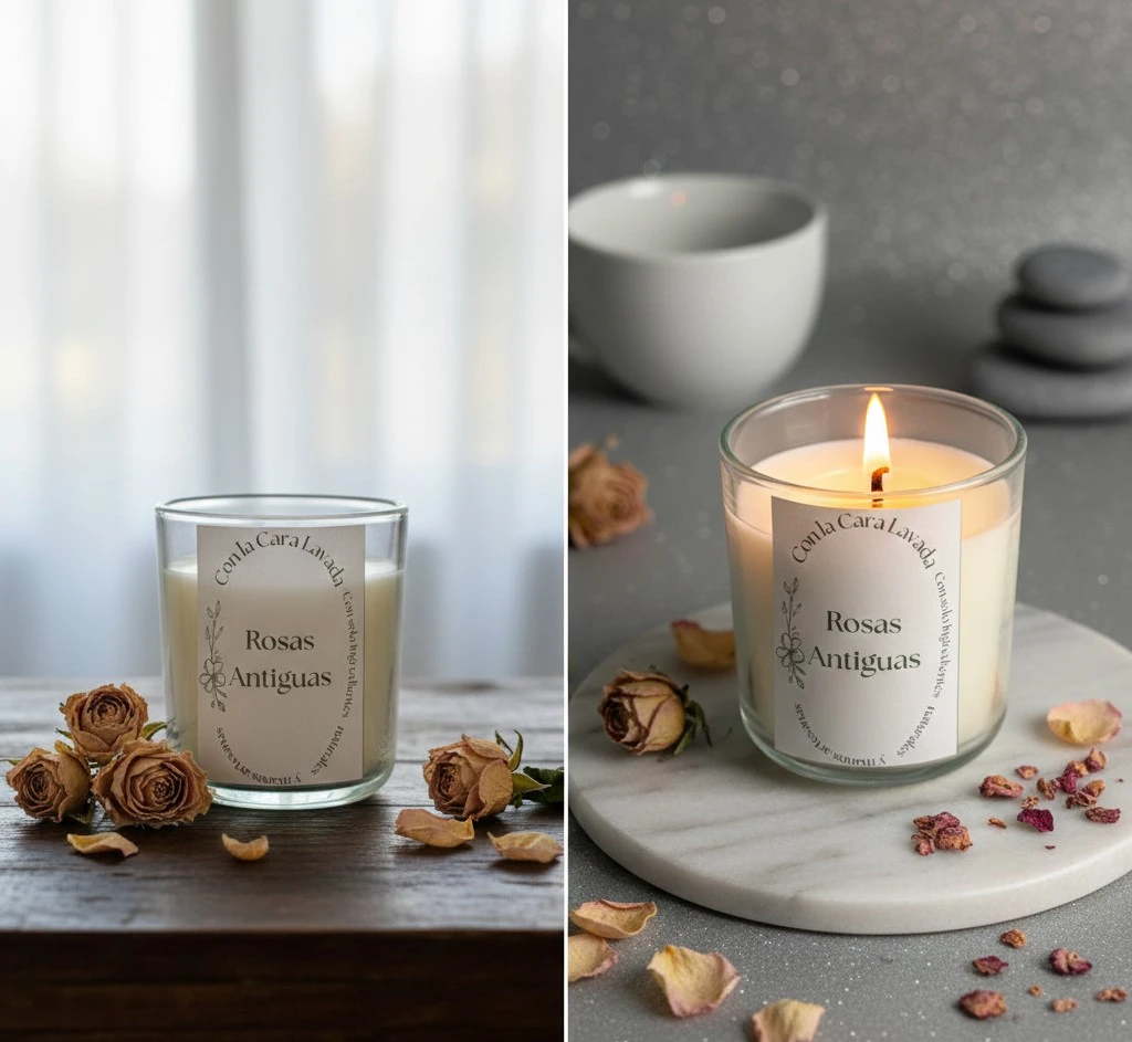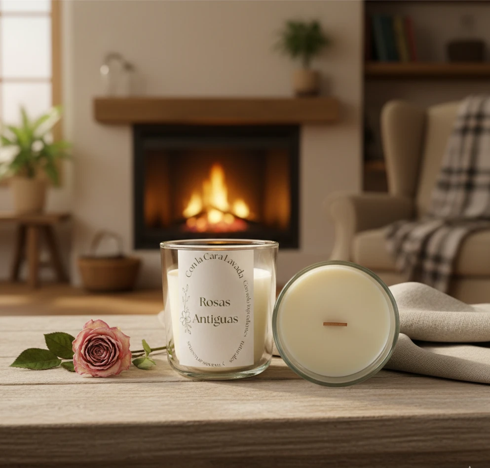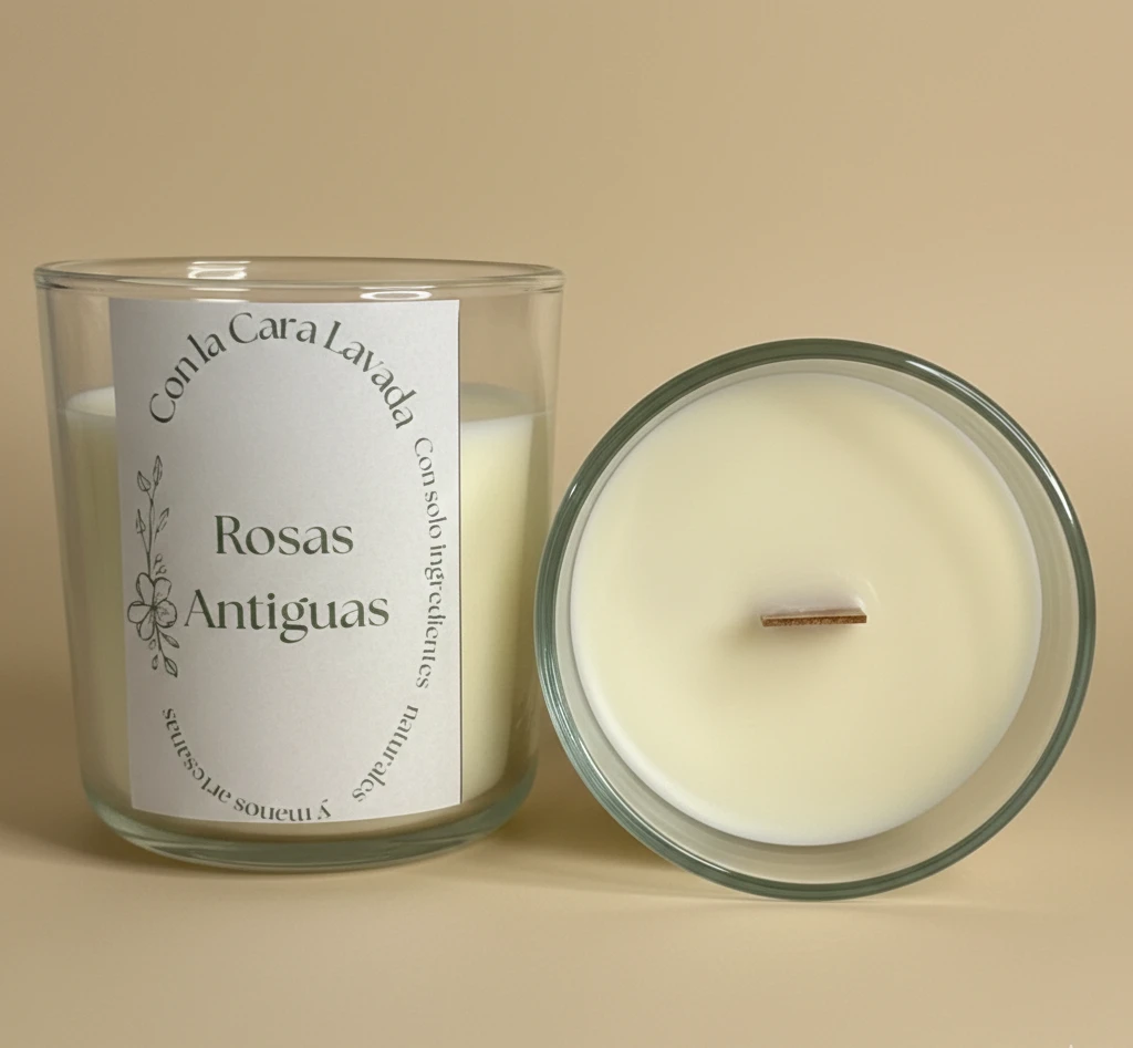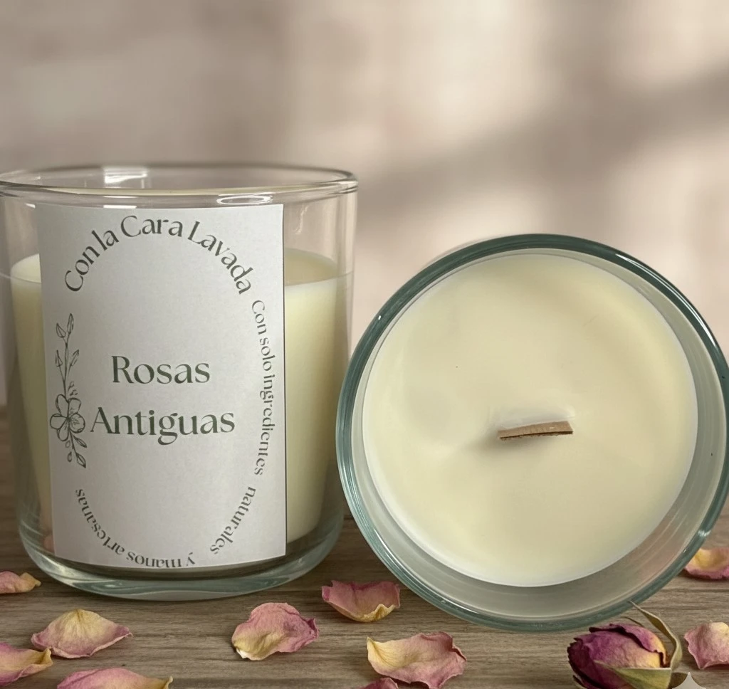 Vela artesanal de soja con aroma a rosas antiguas, delicado, elegante y envolvente. Ideal para crear un ambiente romántico y sofisticado.