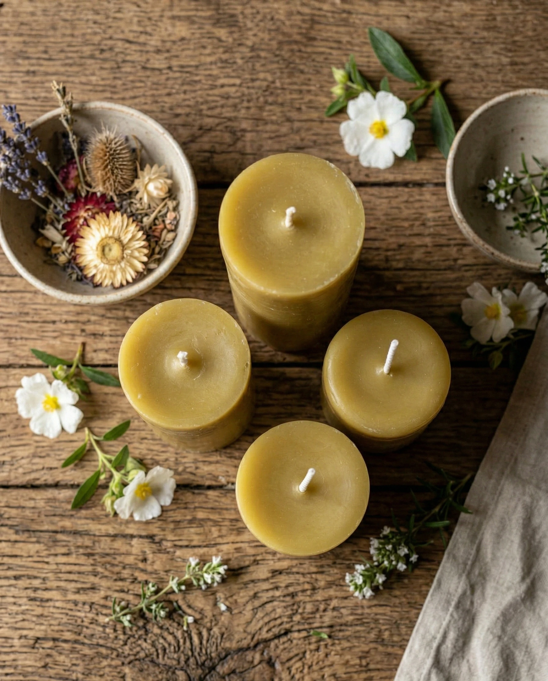 La cera conserva su tono natural y su aroma suave a miel, sin añadidos artificiales.